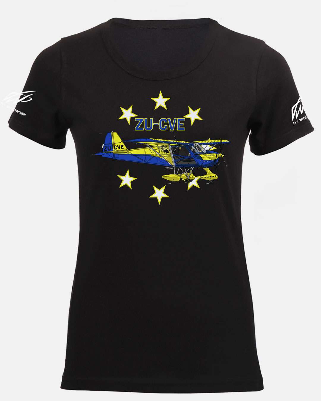 This Cheetah-ZU-CVE Women’s Short Sleeve Fitted BLACK T-Shirt stands out with it star design! This is a special illustration of this Cheetah-ZU-CVE aircraft with its beautiful blue and yellow paint scheme, which is highly detailed, and uniquely designed with love by artist Gerald Smith.
