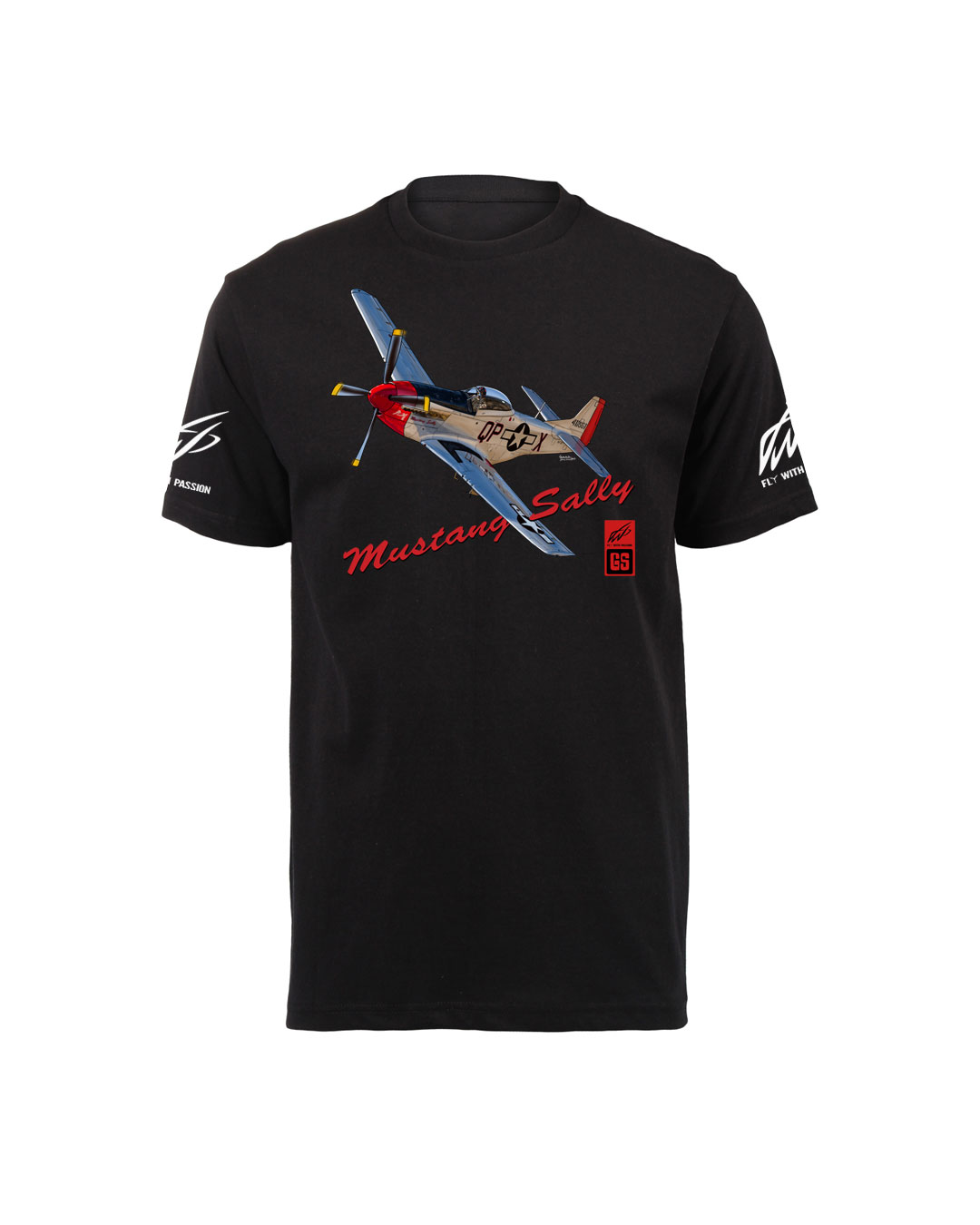 Mustang Sally Exclusive BLACK T-Shirt is very exclusive! This is a special illustration of this the famous, iconic P-51D Mustang Sally aircraft with its beautiful paint scheme, highly detailed, uniquely designed with love by artist Gerald Smith.